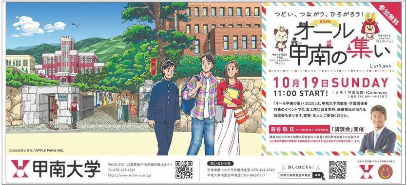 HOME 同窓会事務局 お知らせ・ご報告 「オール甲南の集い2025」の新聞広告が掲載されました 同窓会事務局 「オール甲南の集い2025」の新聞広告が掲載されました 2025.10.13 10月19日に開催される「オール甲南の集い2025」の広告が、12日付の神戸新聞朝刊に掲載されました。甲南ファミリーによる、年に1度のホームカミングイベントです。ご家族、お友達で楽しんでいただけるプログラム満載です。奮ってご参加ください。 (広報部) 各地甲南会 一覧 北海道・東北 北海道甲南会 東北甲南会 関東 東京甲南会 東京甲南会女子部会 中部 信州甲南会 石川甲南会 福井甲南会 東海甲南会 近畿 京都甲南会 北摂甲南会 大阪甲南会 堺甲南会 泉州甲南会 宝塚甲南会 阪神甲南会 神戸甲南会 但馬甲南会 三木甲南会 明石甲南会 東播磨甲南会 姫路甲南会 淡路甲南会 奈良甲南会 和歌山甲南会 中国 岡山甲南会 西中国甲南会 四国 徳島甲南会 香川甲南会 愛媛甲南会 高知甲南会 九州・沖縄 福岡甲南会 沖縄甲南会 海外 ロスアンゼルス甲南会 テキサス甲南会 シンガポール甲南会 バンコク甲南会 シドニー甲南会 インドネシア甲南会 フィリピン甲南会