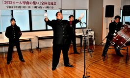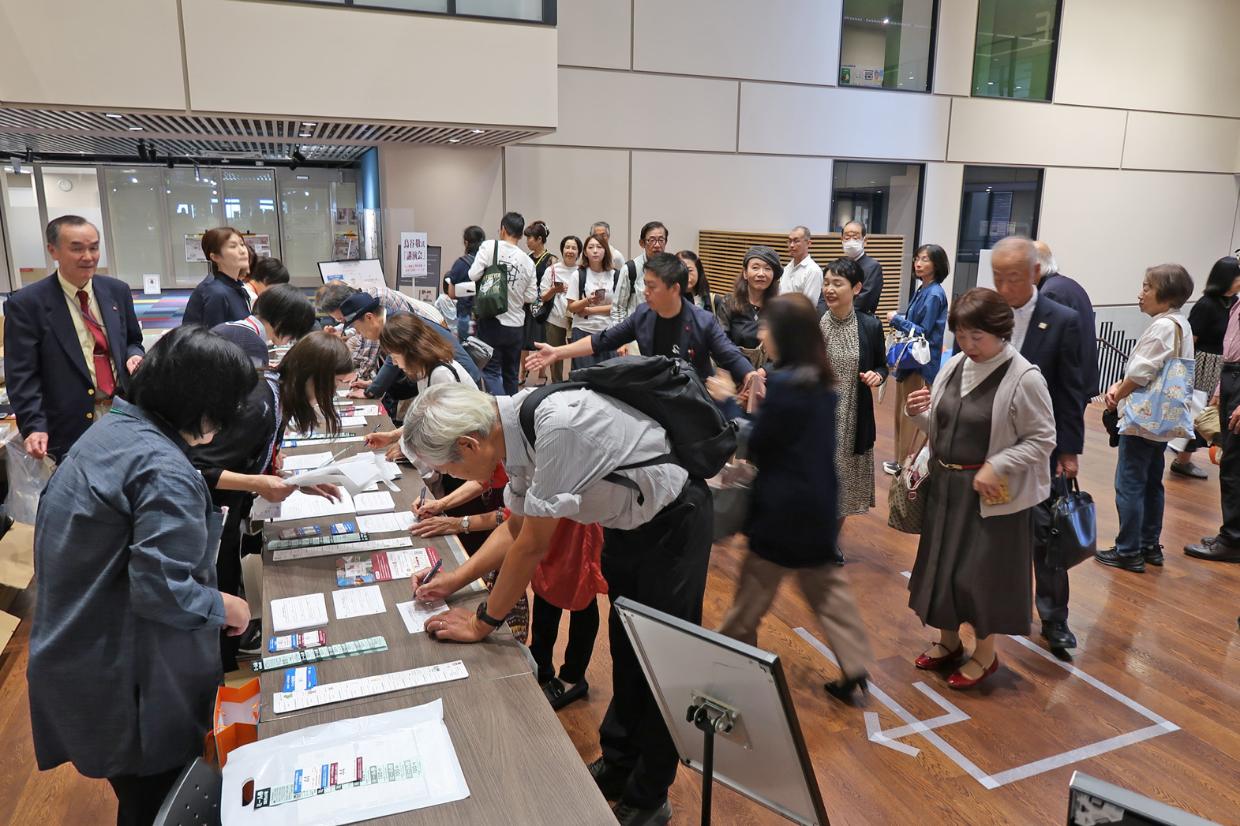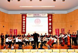 今年は入場の手続きとともに、参加者全員がガラポン抽選会に臨み、早くも熱気むんむん。文化会交響楽団の現役とOBによる歓迎演奏の中、甲友会館でオープニングイベントが開幕しました。グルークラブと交響楽団のOB現役が舞台に立ち、会場の全員で学園歌を斉唱しました。甲南学園の長坂悦敬理事長、甲南大学の中井伊都子学長の挨拶に続き、甲南大学同窓会甲南会の丹羽一郎会長が開会挨拶し、「30年前の阪神・淡路大震災で壊滅的な被害を受けた岡本キャンパスが、かくも立派によみがえった。これもひとえに同窓会の多くの皆さま、学園の多くの方々のご尽力の賜物だと感謝している。盛りだくさんの一日をどうぞ楽しんでください」と呼びかけました。