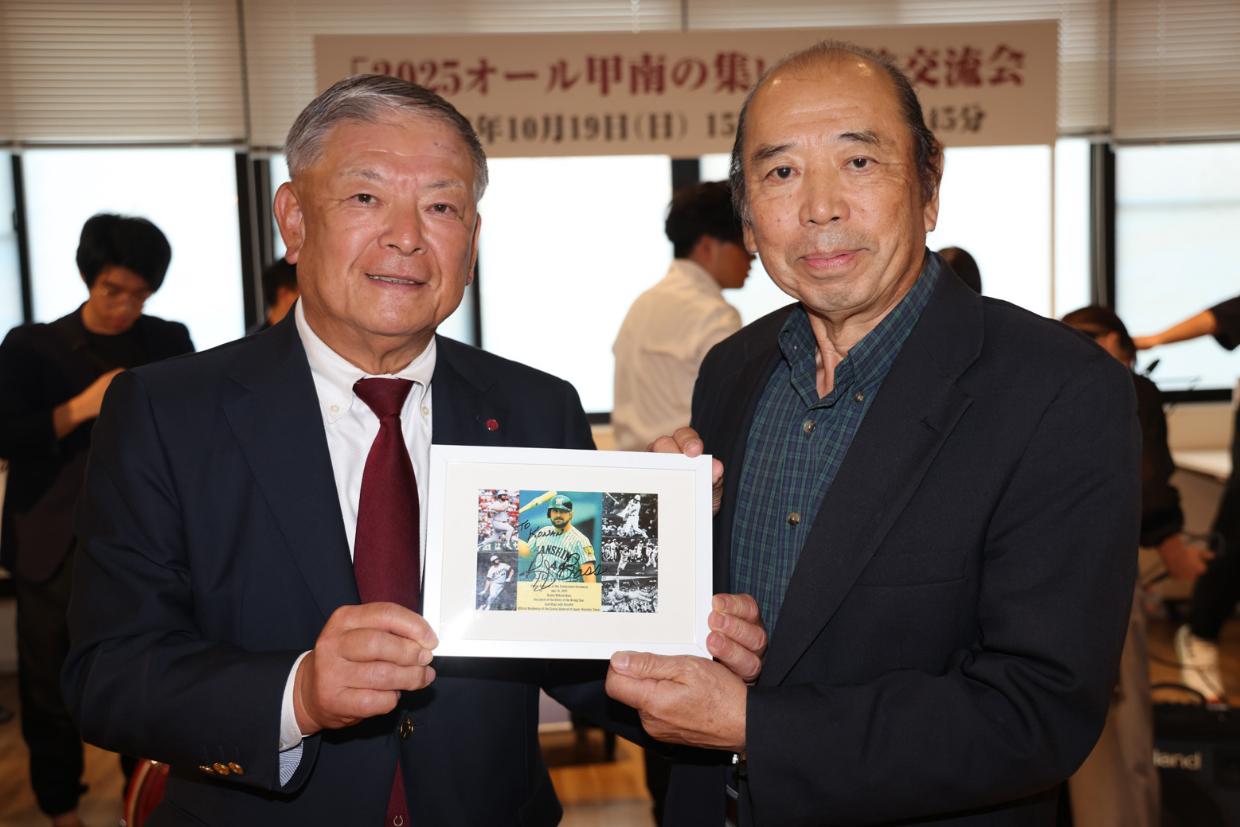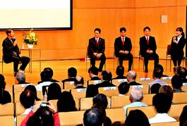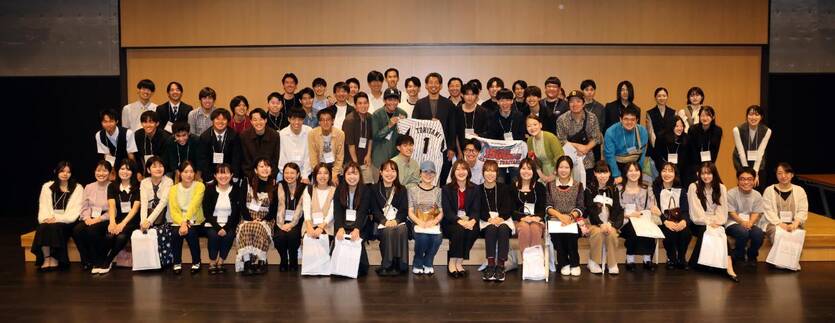 続いて、元阪神タイガースの選手でプロ野球解説として活躍する鳥谷敬さんがスペシャルゲストとして登場。今期リーグ優勝し、日本シリーズを控えた古巣の阪神タイガースについて、その強さの秘密を、ドラフト戦略の変化など独自の視点で解説。自身のタイガース時代の経験も踏まえ、スポーツに打ち込んできた人生を振り返りながら、社会貢献に取り組んでいる思いなどについて約半時間、語りました。講演後は、昨年甲南大学初のプロ野球選手となった岡本駿投手について、硬式野球部の谷口純司監督や選手、マネージャーらが登壇し、鳥谷さんに質問。谷口監督が岡本投手へのアドバイスを尋ねると、鳥谷さんは「長くやっている選手は自分を知っている。自分が何を評価してもらってプロに入ったのか、何でこの世界でやっていけるのかを冷静に判断できるかどうか。『自分とは』を問い続けることが大切」とエールを送りました。