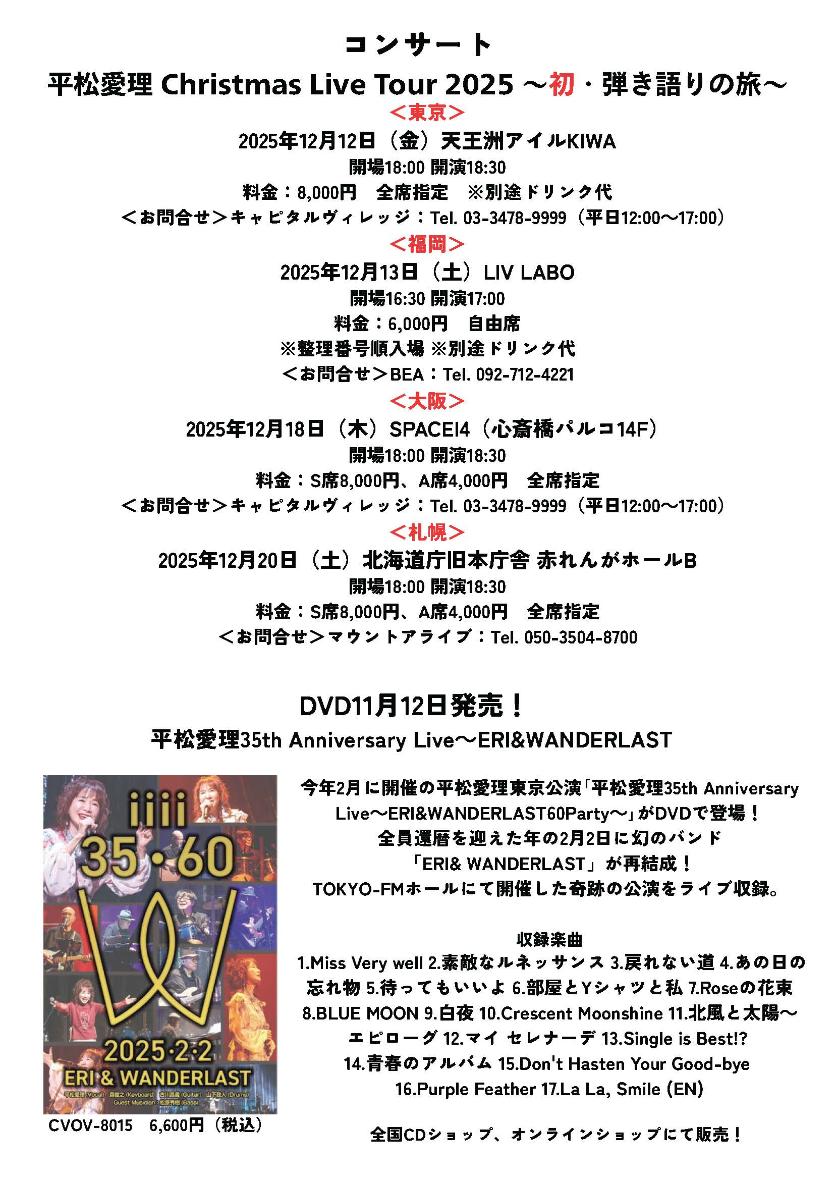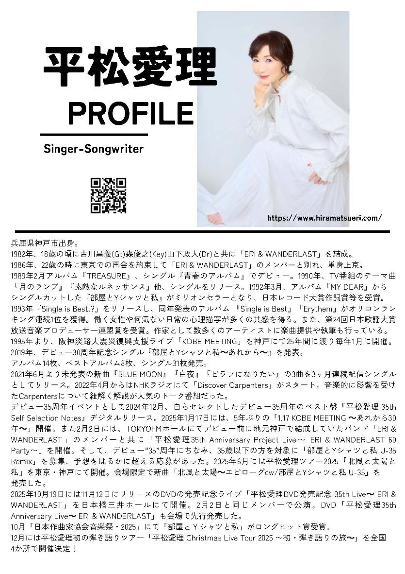 愛理さんは、阪神・淡路大震災で実家が大きな被害を受けたのを機に、毎年、チャリティーライブを続けてこられています。震災30年の今年は愛理さんにとっても転機となることがたくさんあり、今年10月には大ヒット曲「部屋とYシャツと私」が、「日本作曲家協会音楽祭・2025」にて<ロングヒット賞>を受賞されました。また、12月には初の弾き語りツアー「平松愛理 Christmas Live Tour 2025 ~初・弾き語りの旅~」を全国4か所で開催されます。当日は、「部屋とYシャツと私」の話をはじめ、震災チャリティへの思いなど、いろんなお話もしていただけそうです。どうぞお楽しみに!