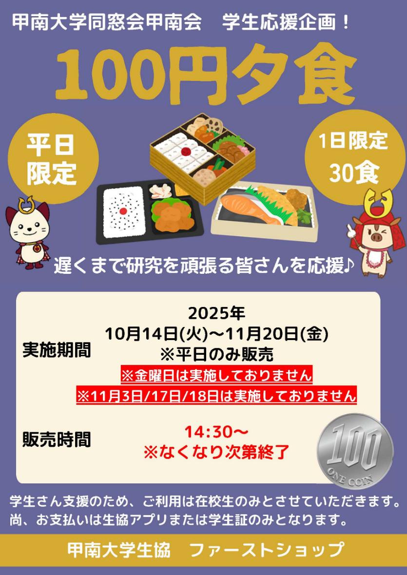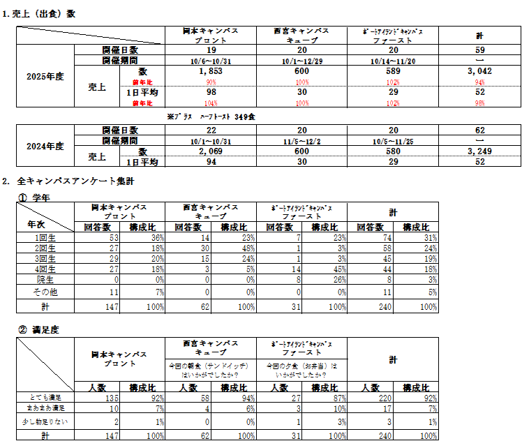 毎回新学期が始まると「いつからやってくれるんですか?」「今回もやってくれるんですか」と問い合わせをいただくようになりました。今回はジュースをグレードアップしたことで、嬉しいという声も多く聞きました。アンケートでは「おなかいっぱいで授業が受けられた」「下宿生の味方」という言葉や全体的に「有難う」という言葉で溢れました。