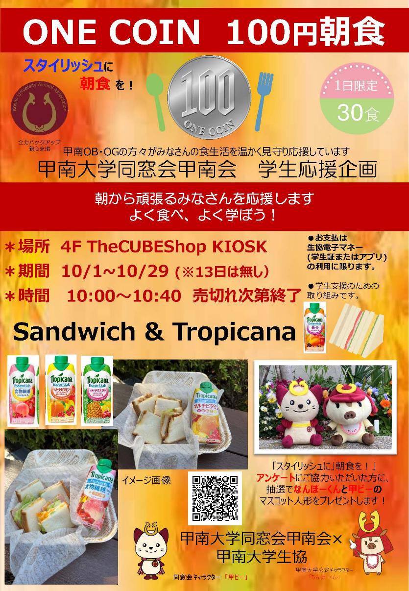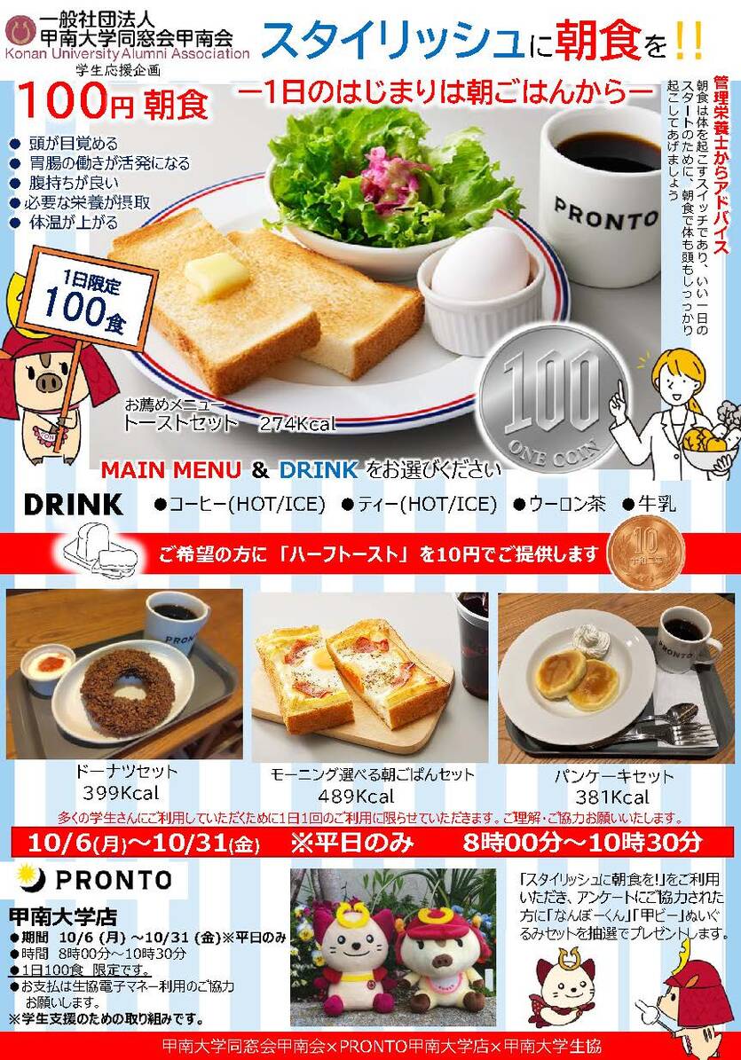 今年度後期も、前期に引き続き2017年度から学生の皆さんに朝食を摂ってもらい、一日の生活リズムをつくって元気に授業に出てもらおうとスタートした「スタイリッシュに朝食を!」が甲南大学生活協同組合にご協力いただき実施されました。