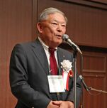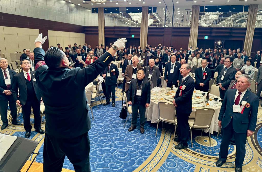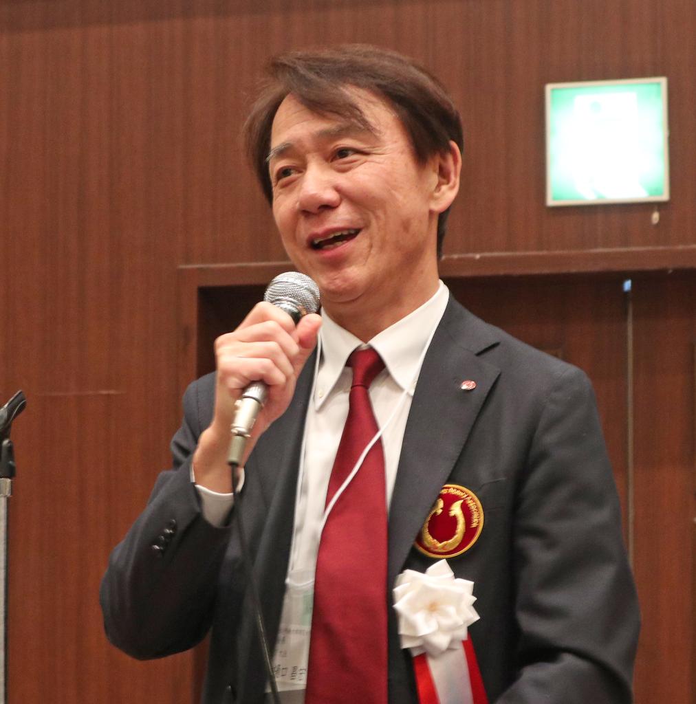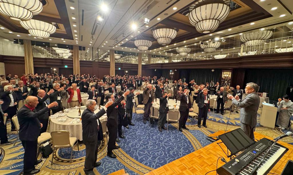 はじめに大学同窓会の丹羽一郎会長が登壇し、「今年は初めて取り組む大イベントが2つあった。一つは大阪・関西万博でのファミリーパーティー。そして今宵の兵庫合同甲南会。18社の卒業生の会社のお酒やお菓子が並んでいる。きょうは大忘年会。一年を振り返りながら、思い切り盛り上がりましょう」と挨拶しました。