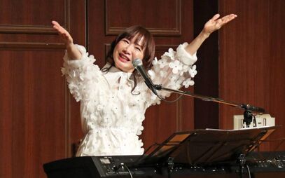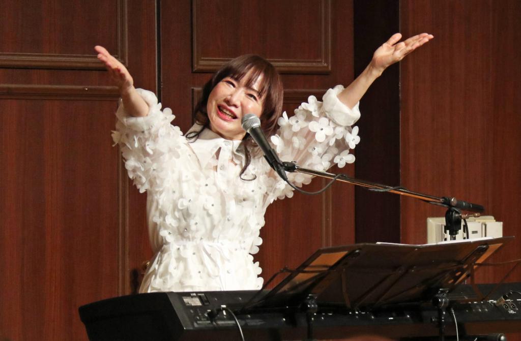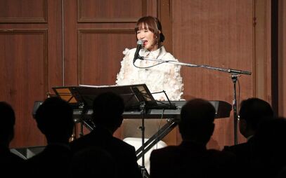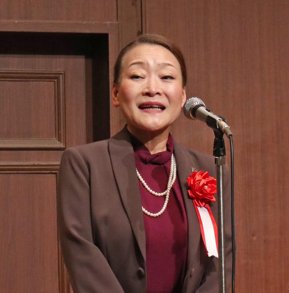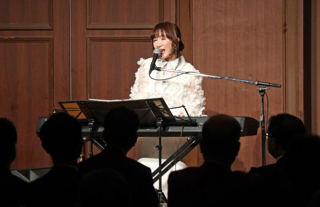乾杯後は、神戸出身のシンガー・ソングライター平松愛理さんのミニライブ。「やっと来ることができました!感激の一日です。思い切り、心から歌をお届けしたい」と挨拶後、1992年のレコード大賞作詞賞に輝き、今年は日本音楽作曲家協会の「ロングヒット賞」を受賞した大ヒット曲「部屋とYシャツと私」を歌いました。トークでは、高校時代のバンド活動を経たデビュー35周年の思い出、コロナ禍での苦悩、阪神・淡路大震災以降に続けてきた復興支援コンサート「1.17 KOBE MEETING」を今年5年ぶりに開催した思いなどを語り、「北風と太陽~エピローグ~」「Single is Best!?」を披露。最後は、阪神・淡路大震災30年にちなみ、淡路島出身の作詞家・阿久悠さんと共作した復興ソング「美し都~がんばろやWe love KOBE~」を会場とともに歌いました。