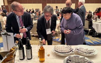 兵庫合同甲南会は、2025年度の同窓会の活動テーマ「つどい、つながり、ひろがろう!」にのっとり、ふだん参加している各地甲南会の枠を超え、広い地域の同窓生が集うことで交流の輪をさらに広げていこう―と、第一弾として母校の地元で初開催。甲南学園からは長坂悦敬理事長、甲南大学の中井伊都子学長をはじめ5人に参加いただき、県内各地の甲南会だけでなく、県外からも多数の参加がありました。この日は「兵庫うまいモン巡り」と題して開かれ、ホテルの料理は兵庫県にちなんだ食材で提供されたほか、同窓生が経営する蔵元の銘酒や甘味処の菓子なども振舞われ、地元ひょうごや同窓生の活躍をたっぷり味わえるひとときとなりました。