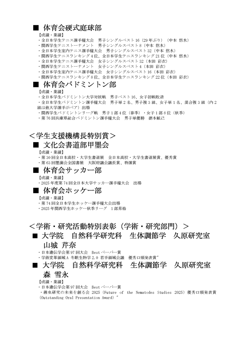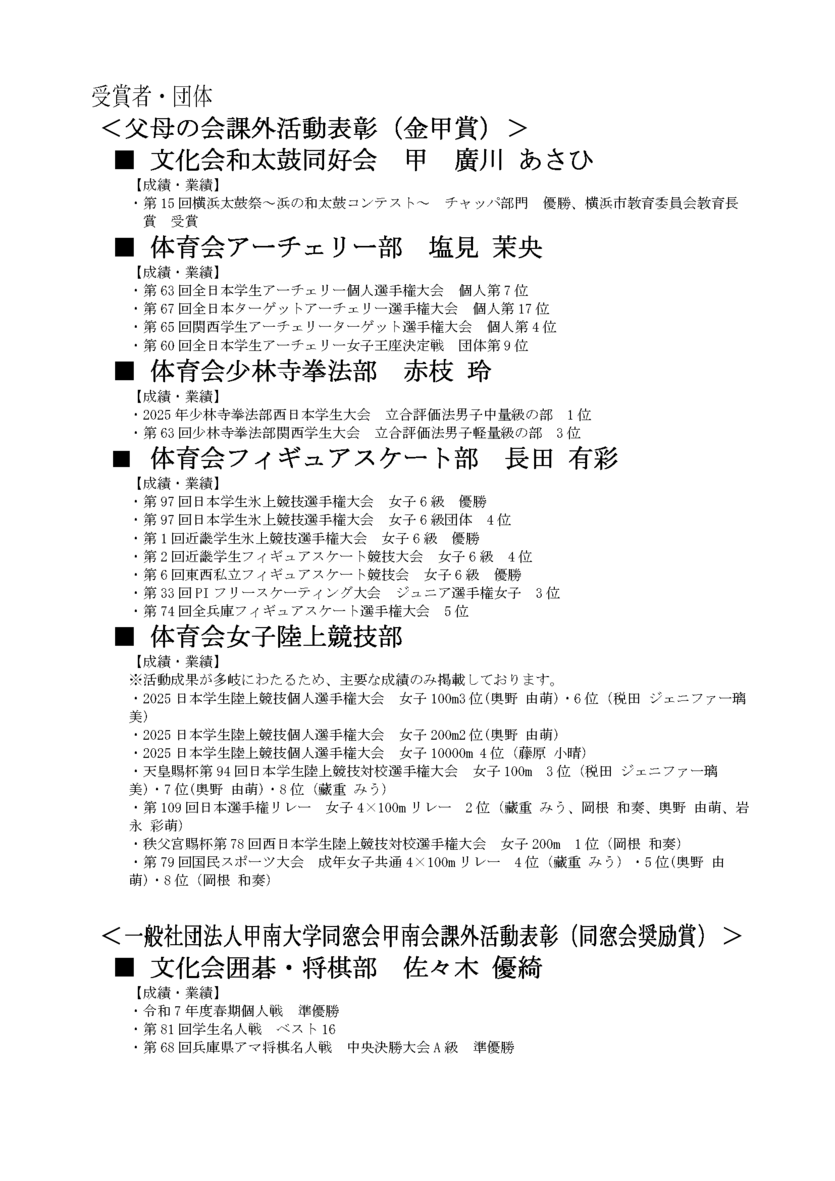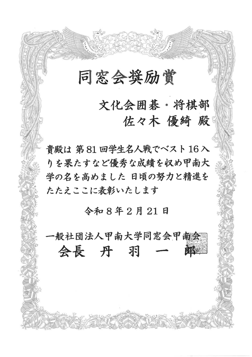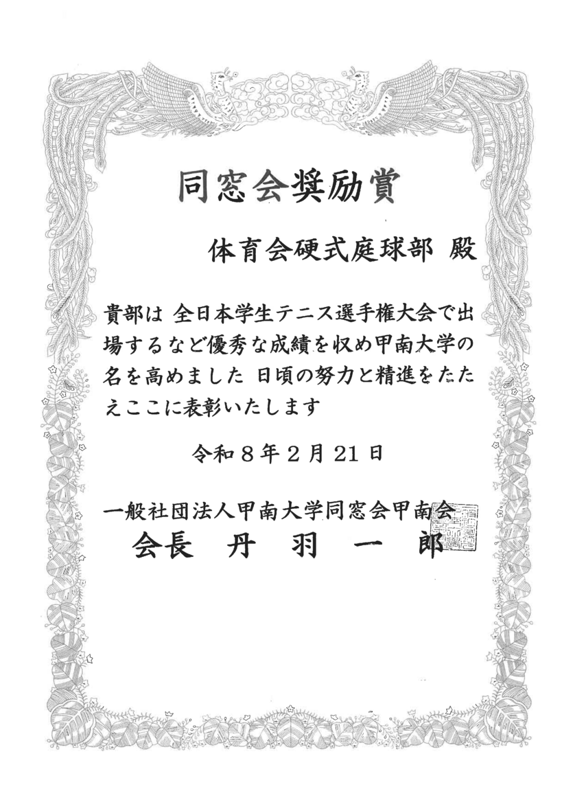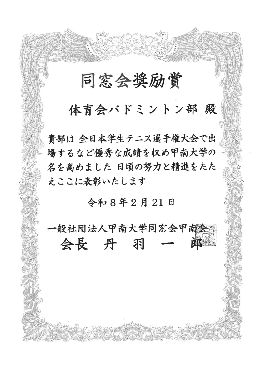 一般社団法人甲南大学同窓会甲南会課外活動表彰(奨励賞)