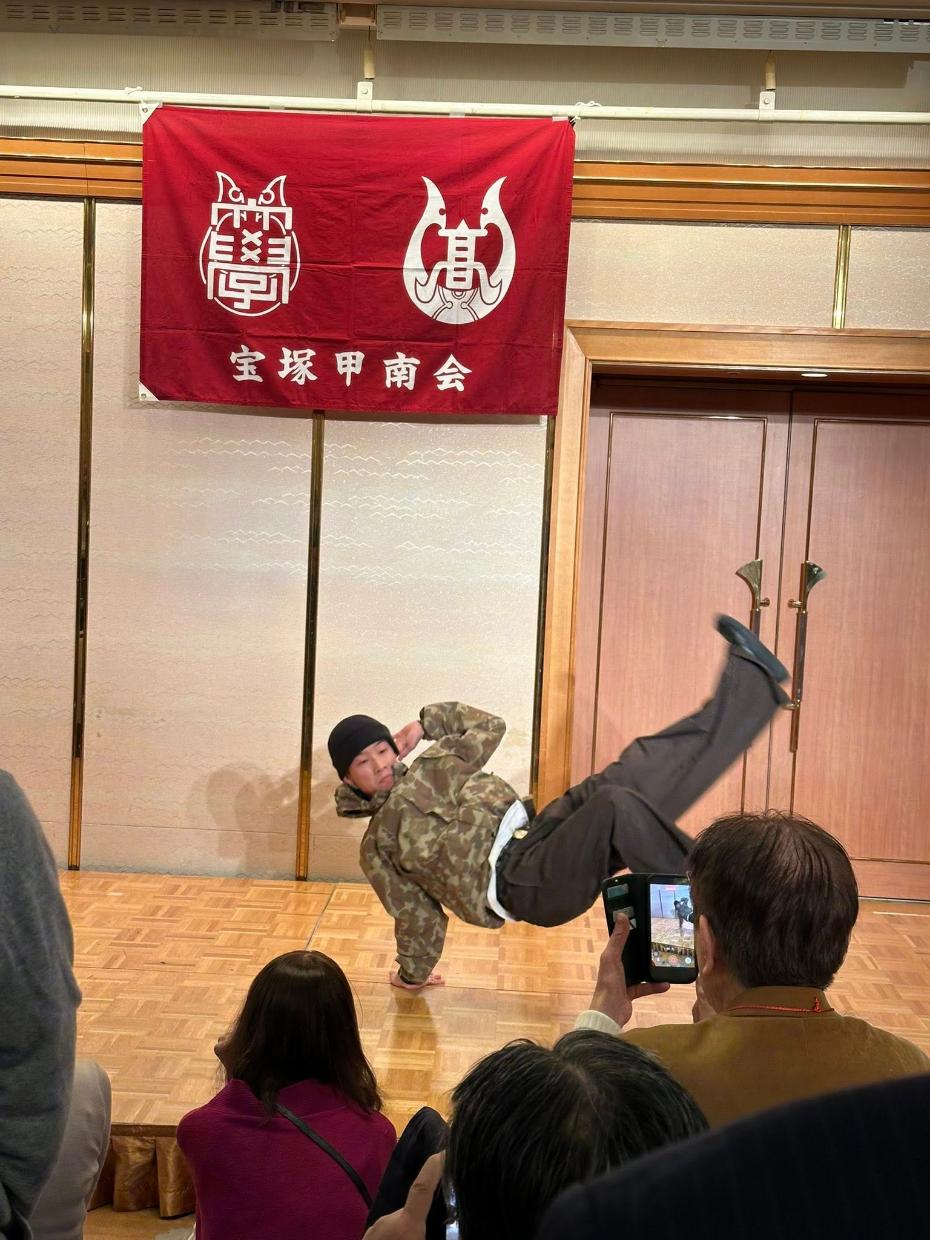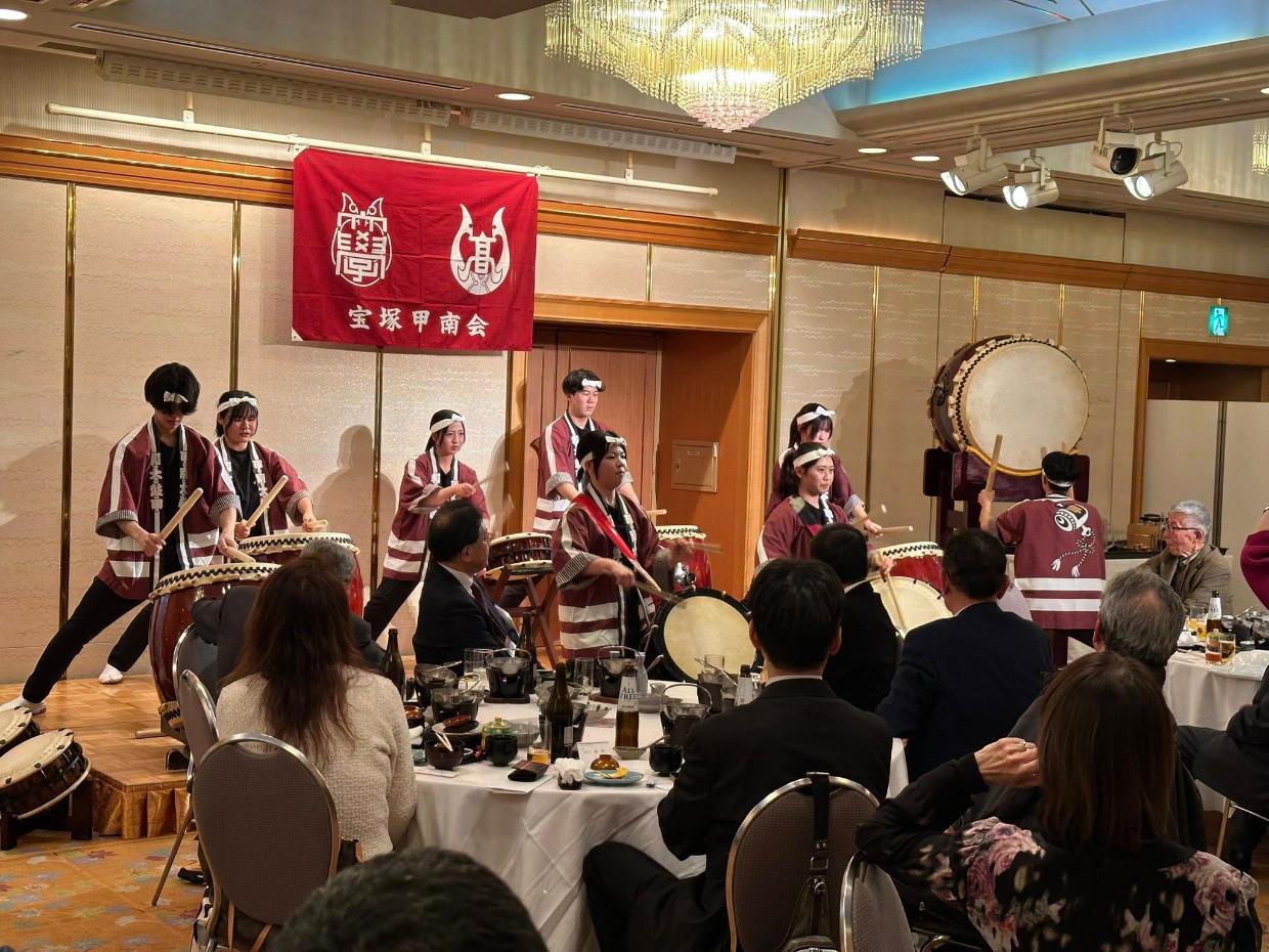 幕開けを飾ったのは、現役学生・藤ケ崎大海さんによる躍動感あふれるブレイキングダンスです。松岡会長の挨拶に続き、片山副理事長より温かいご祝辞をいただき、大西常勤理事の乾杯の発声とともに宴がスタート。今回は記念例会として、和太鼓サークル「甲(きのえ)」の皆さまによる演舞も披露され、その力強い響きに会場全体が一体となって盛り上がりました。